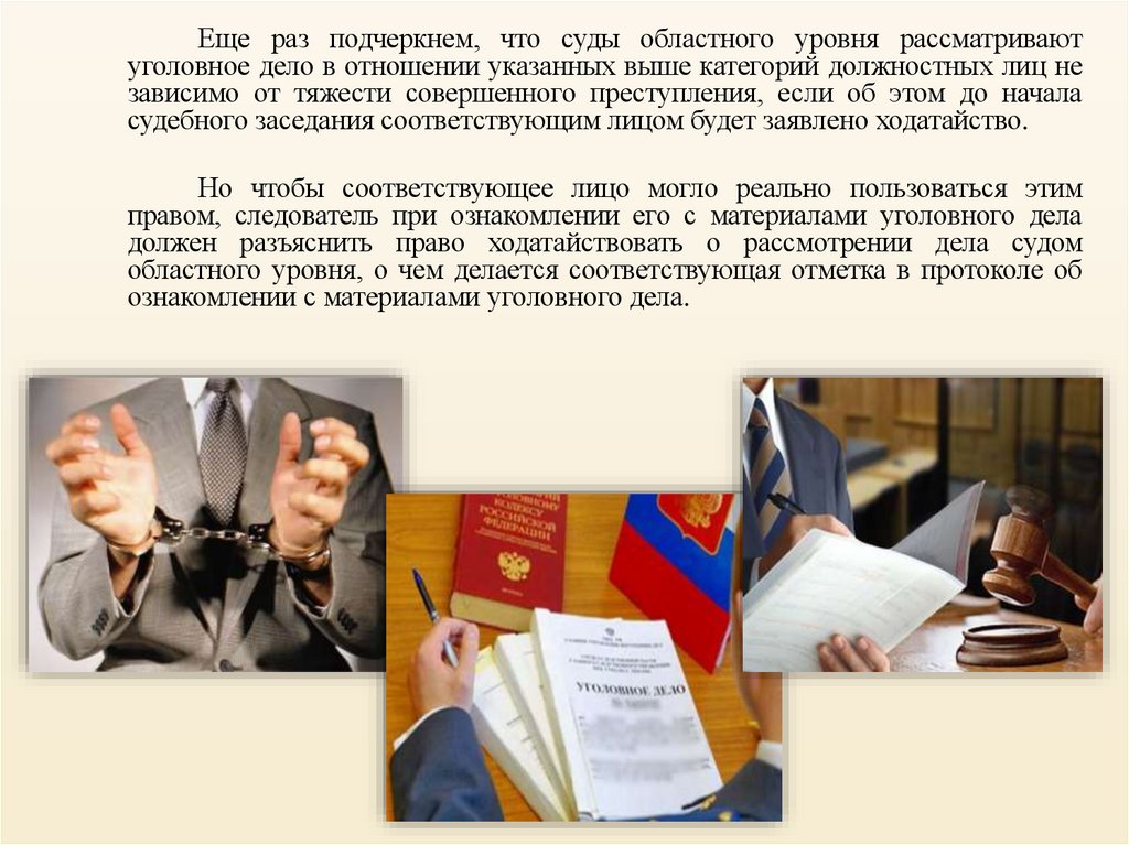 Еще раз подчеркнем, что суды областного уровня рассматриваютуголовное дело в отношении указанных выше категорий должностных лиц не