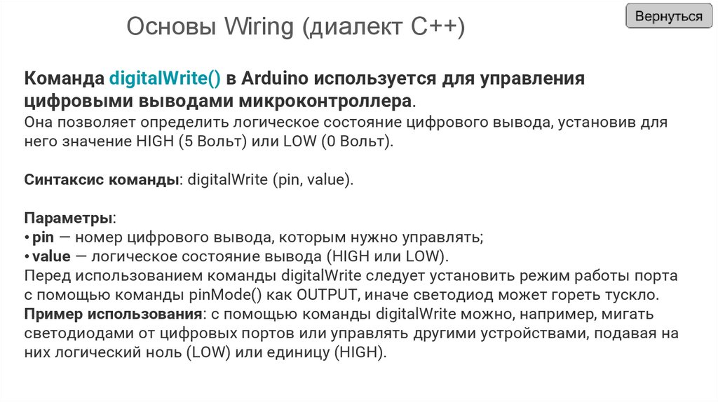 Основы Wiring (диалект C++)Команда digitalWrite() в Arduino используется для управления