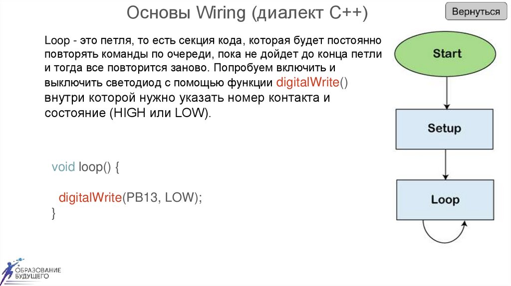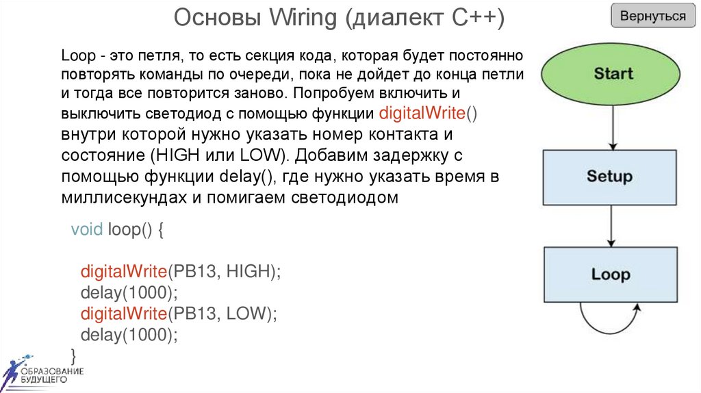 Основы Wiring (диалект C++)Loop - это петля, то есть секция кода, которая будет постоянно