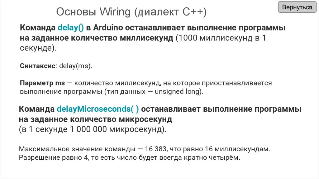 Основы Wiring (диалект C++)Команда delay() в Arduino останавливает выполнение программы