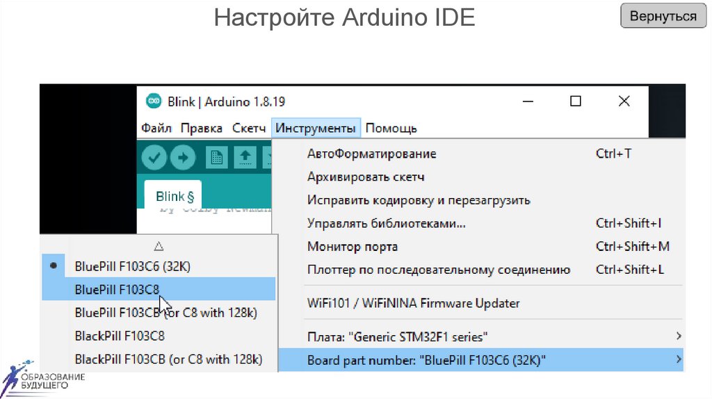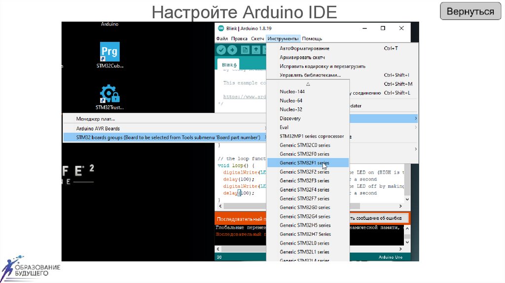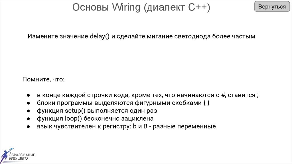 Основы Wiring (диалект C++)Измените значение delay() и сделайте мигание светодиода более частым