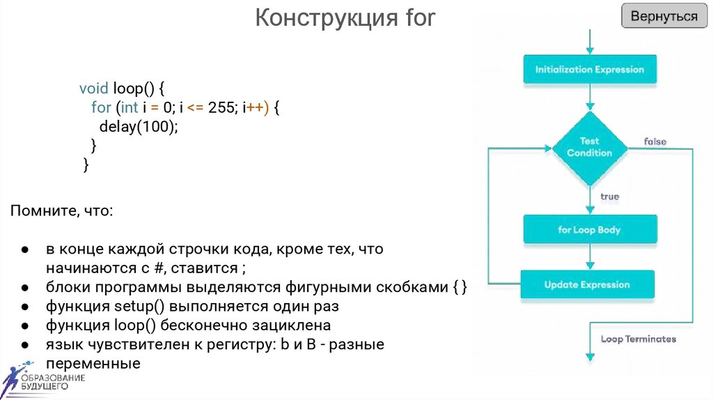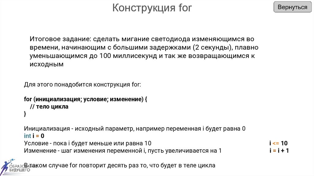 Конструкция forИтоговое задание: сделать мигание светодиода изменяющимся во