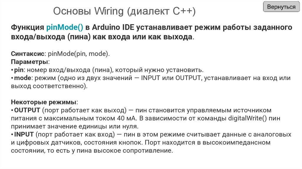 Основы Wiring (диалект C++)Функция pinMode() в Arduino IDE устанавливает режим работы заданного