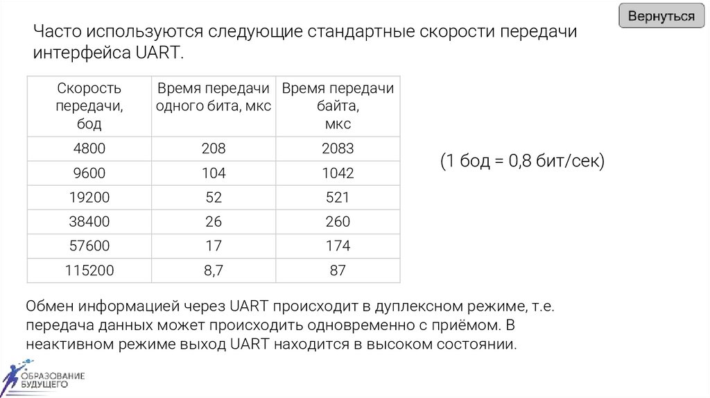 Часто используются следующие стандартные скорости передачиинтерфейса UART.