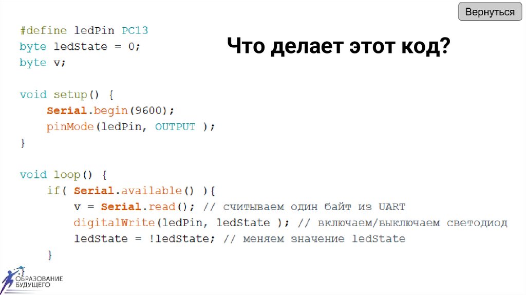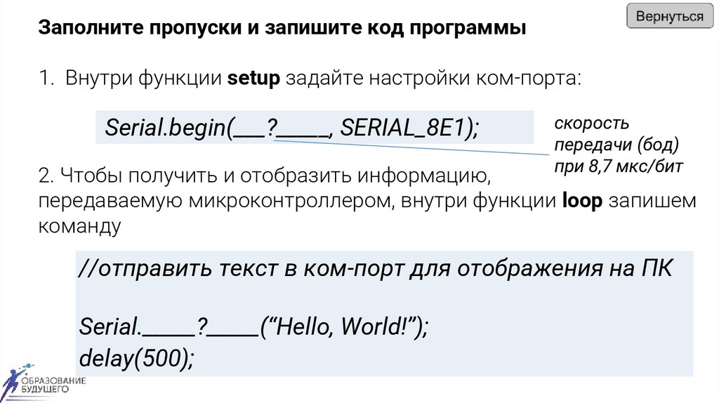 Заполните пропуски и запишите код программы1. Внутри функции setup задайте настройки ком-порта: