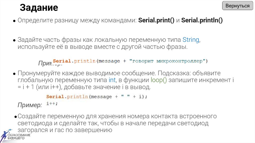 Задание● Определите разницу между командами: Serial.print() и Serial.println()