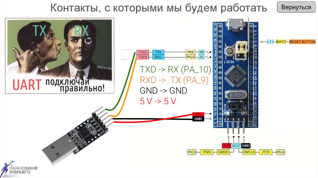Контакты, с которыми мы будем работатьTXD -> RX (PA_10)