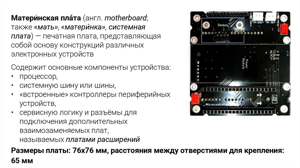 Матери́нская пла́та (англ. motherboard;также «мать», «матери́нка», системная
