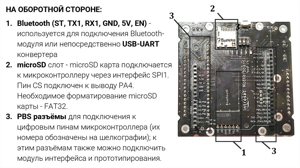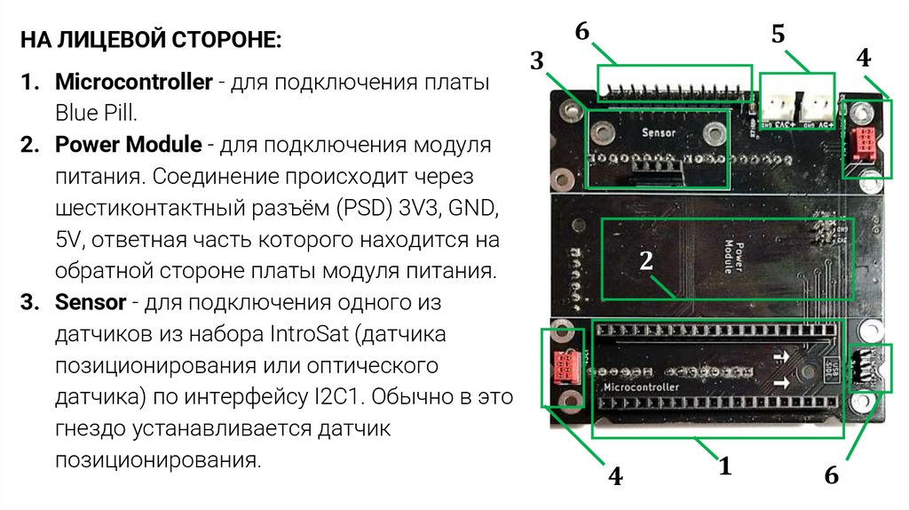 НА ЛИЦЕВОЙ СТОРОНЕ:1. Microcontroller - для подключения платы