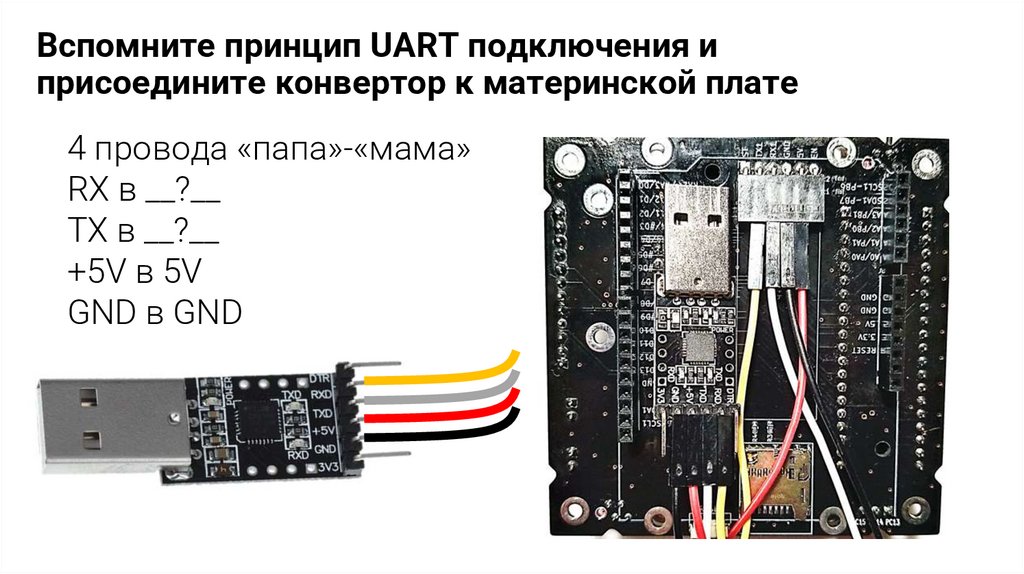 Вспомните принцип UART подключения иприсоедините конвертор к материнской плате