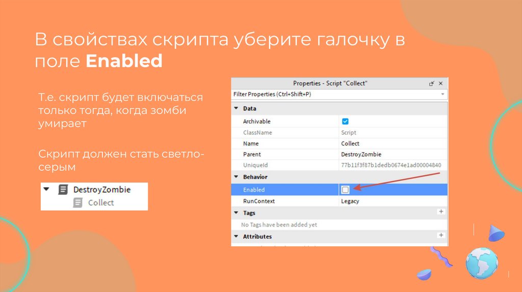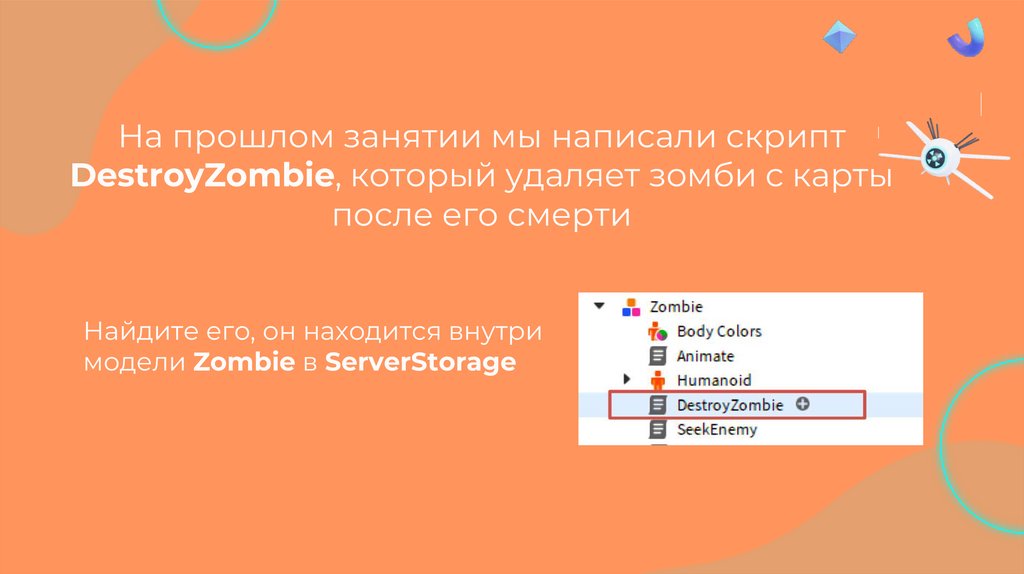 На прошлом занятии мы написали скриптDestroyZombie, который удаляет зомби с карты