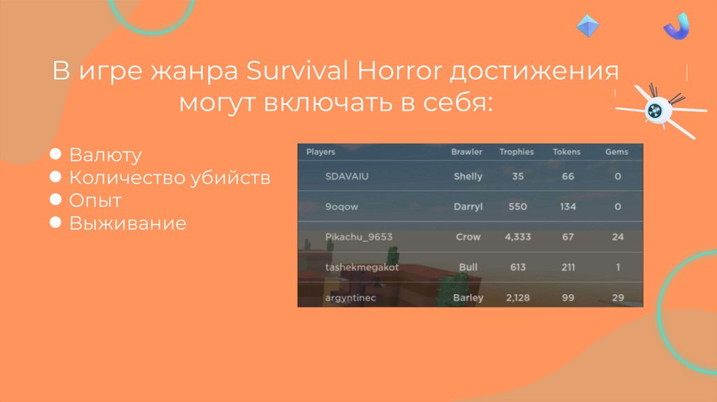 В игре жанра Survival Horror достижениямогут включать в себя: