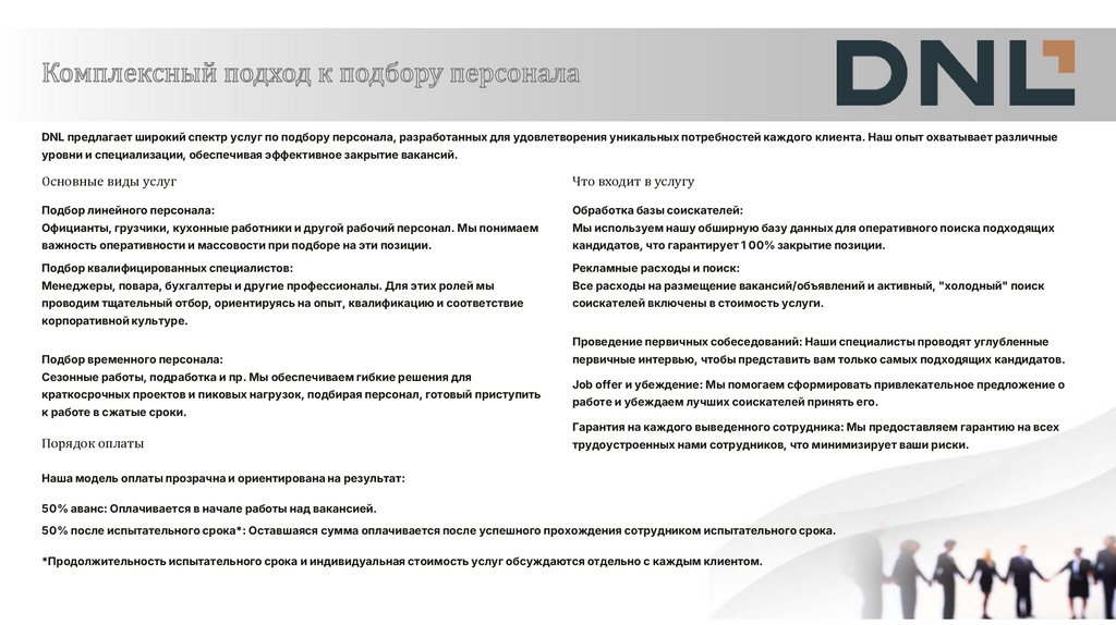 Профессиональный подбор персонала DNLКомпания DNL предлагает комплексные решения по подбору персонала, адаптированные под