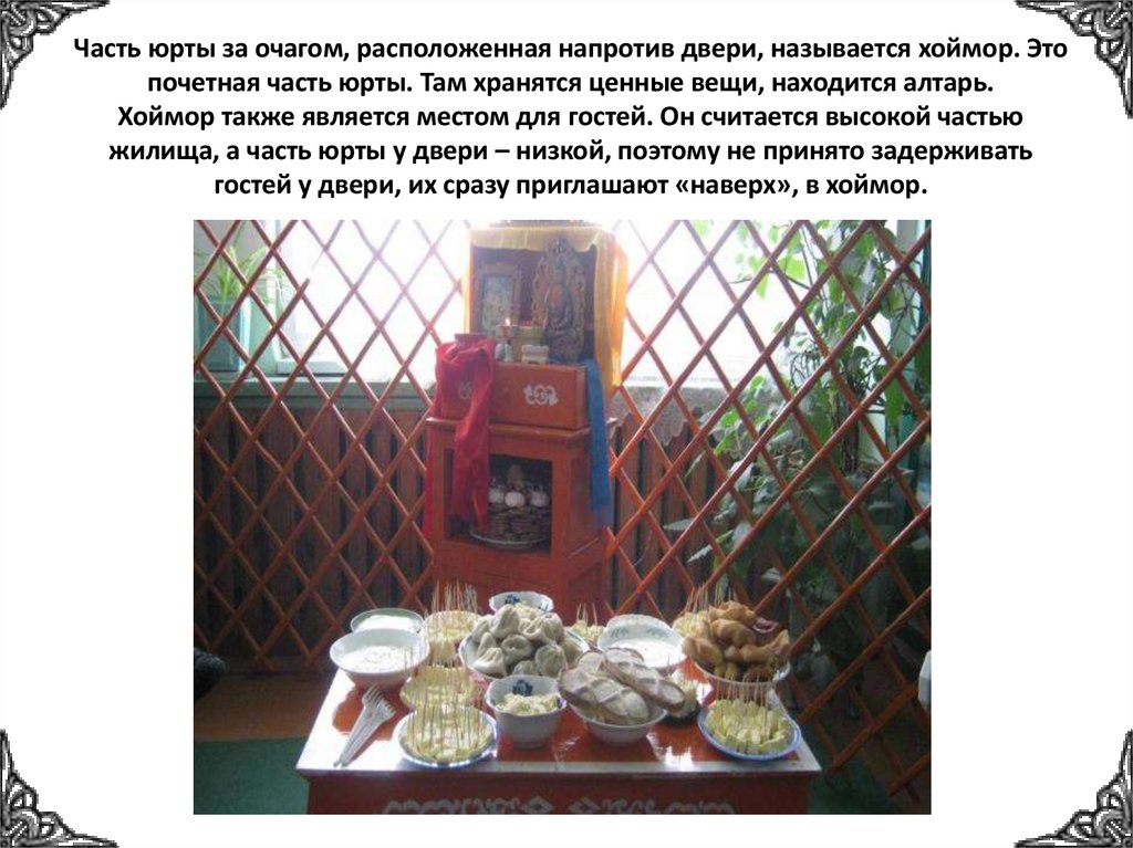 Часть юрты за очагом, расположенная напротив двери, называется хоймор. Этопочетная часть юрты. Там хранятся ценные вещи, находится алтарь.