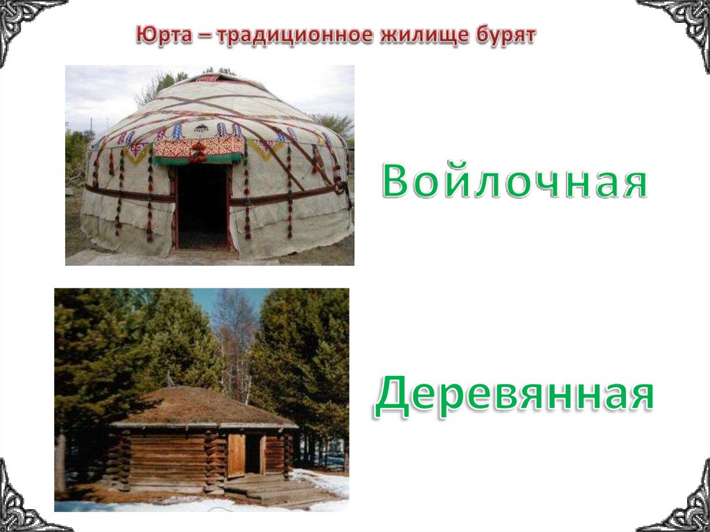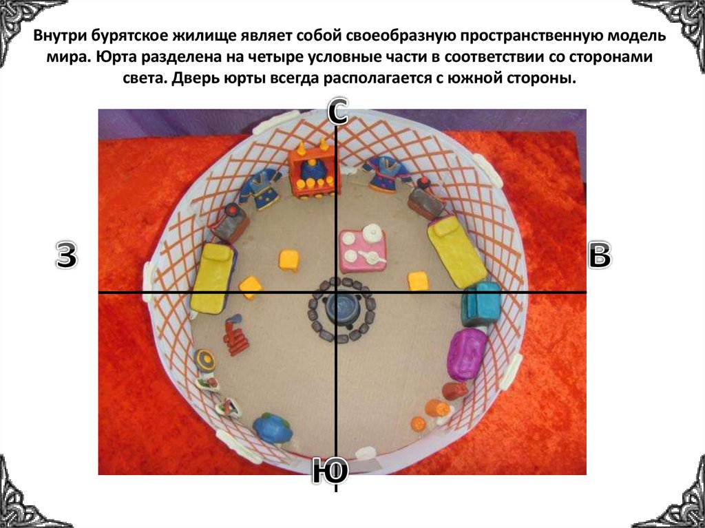 Внутри бурятское жилище являет собой своеобразную пространственную модельмира. Юрта разделена на четыре условные части в соответствии со сторонами