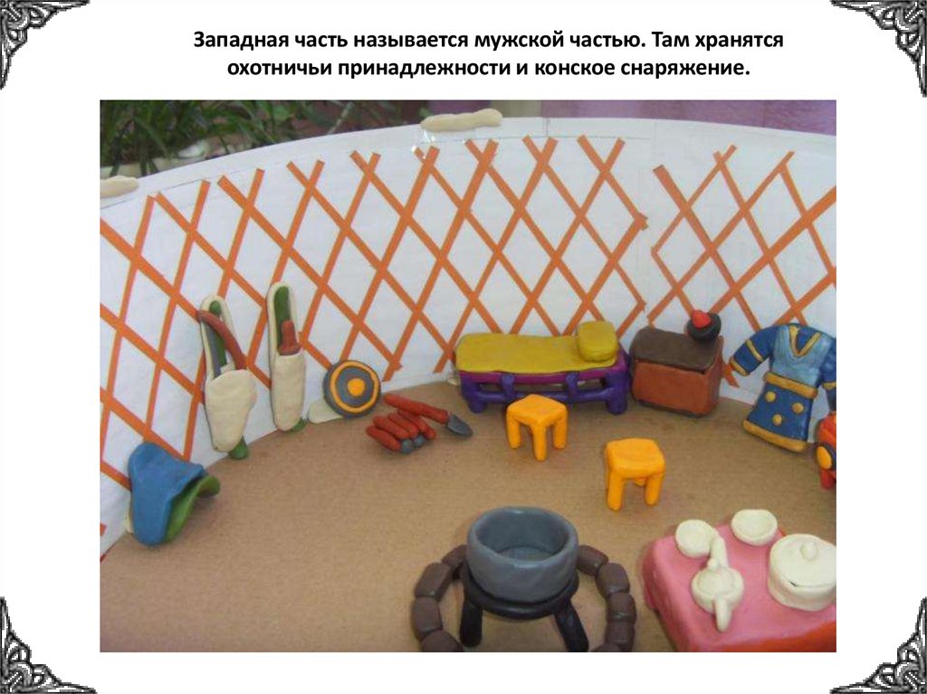 Западная часть называется мужской частью. Там хранятсяохотничьи принадлежности и конское снаряжение.