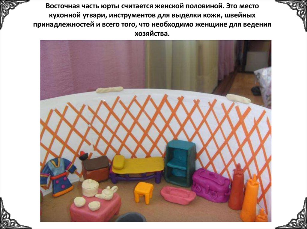 Восточная часть юрты считается женской половиной. Это местокухонной утвари, инструментов для выделки кожи, швейных