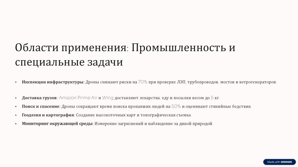 Инспекции инфраструктуры: Дроны снижают риски на 70% при проверке ЛЭП, трубопроводов, мостов и ветрогенераторов.