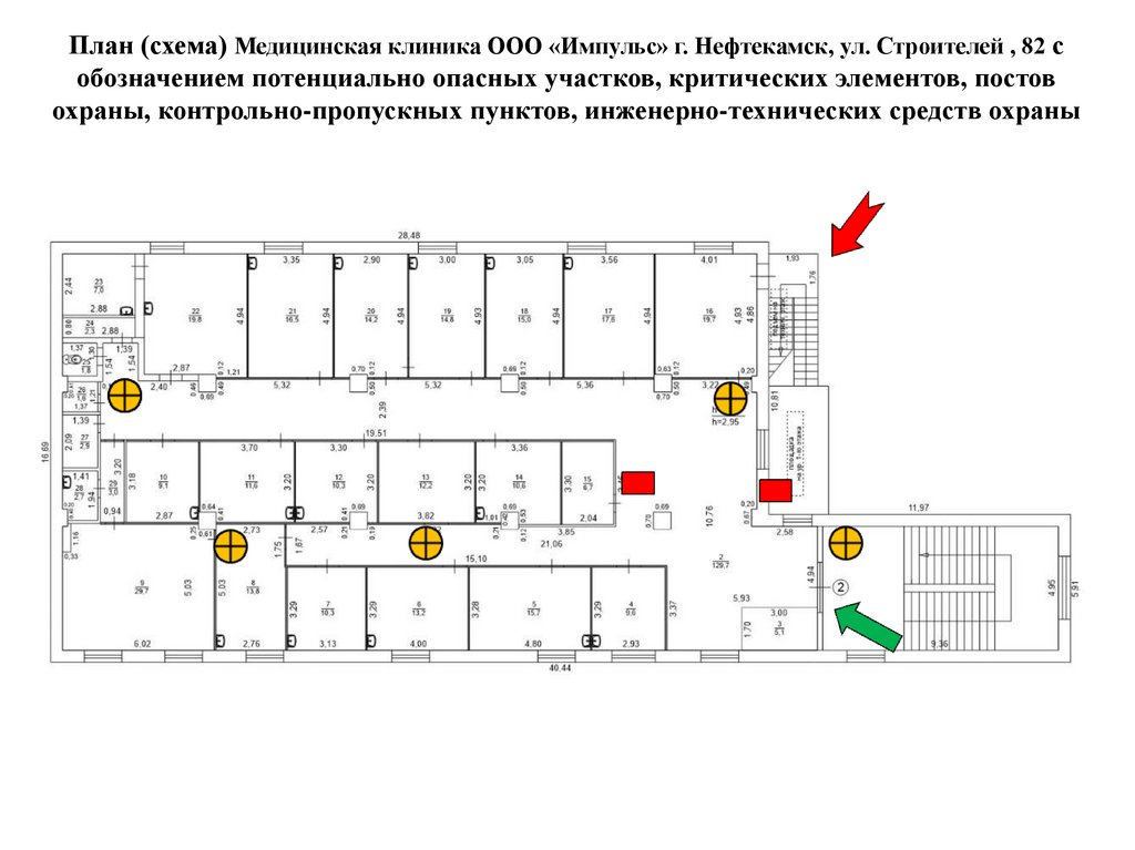 План (схема) Медицинская клиника ООО «Импульс» г. Нефтекамск, ул. Строителей , 82 собозначением потенциально опасных участков, критических элементов, постов