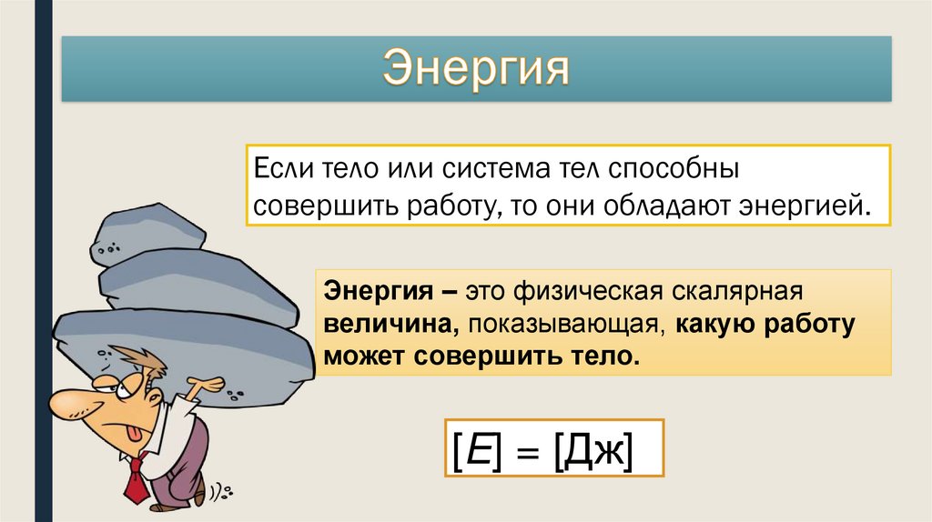 Если тело или система тел способнысовершить работу, то они обладают энергией.