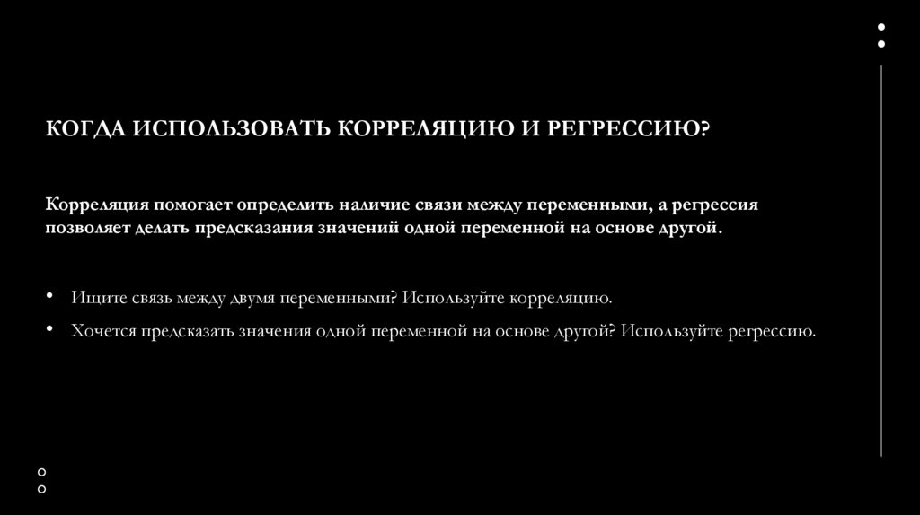 КОГДА ИСПОЛЬЗОВАТЬ КОРРЕЛЯЦИЮ И РЕГРЕССИЮ?Корреляция помогает определить наличие связи между переменными, а регрессия
