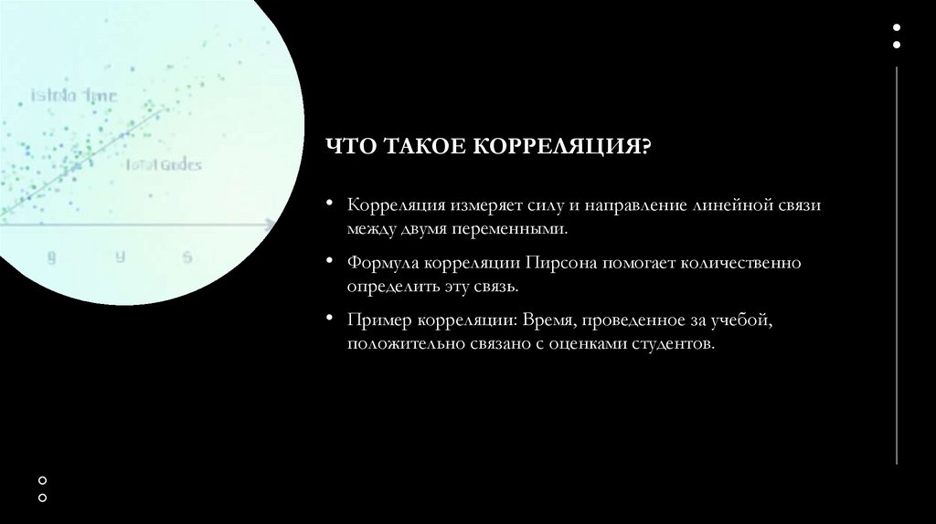 • Корреляция измеряет степень линейной зависимости между двумя переменными.