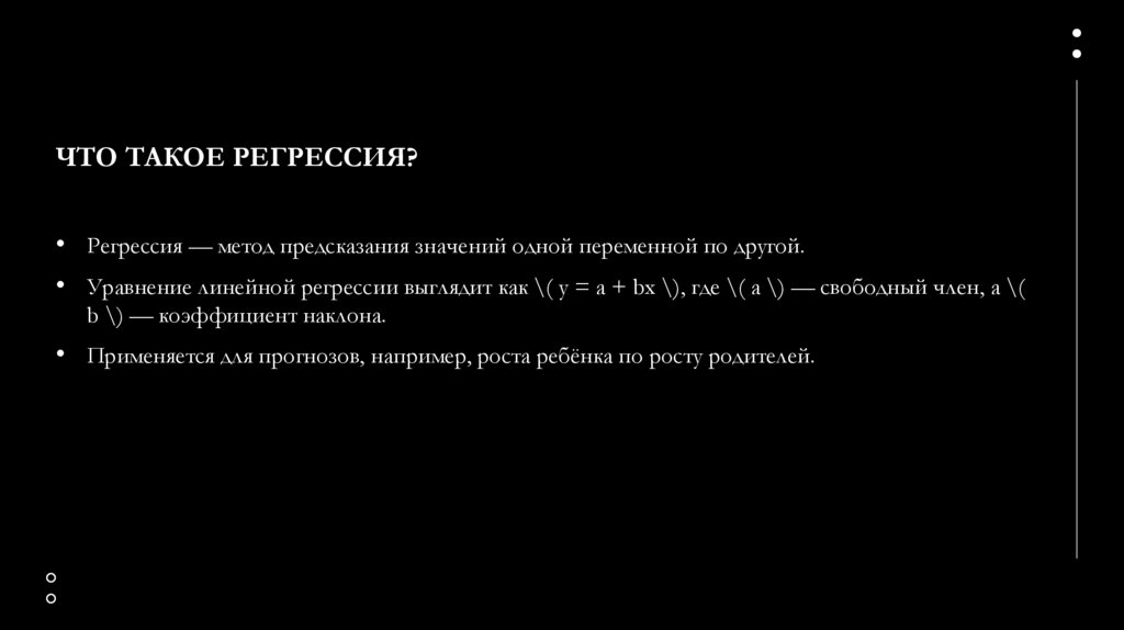 ЧТО ТАКОЕ РЕГРЕССИЯ?• Регрессия — метод предсказания значений одной переменной по другой.