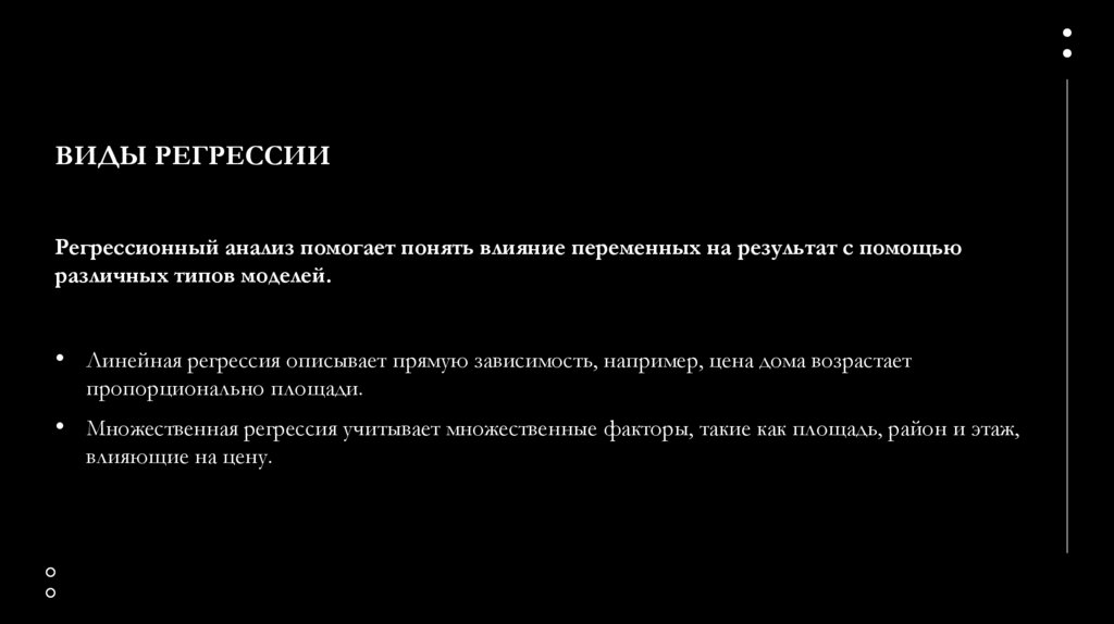 ВИДЫ РЕГРЕССИИРегрессионный анализ помогает понять влияние переменных на результат с помощью