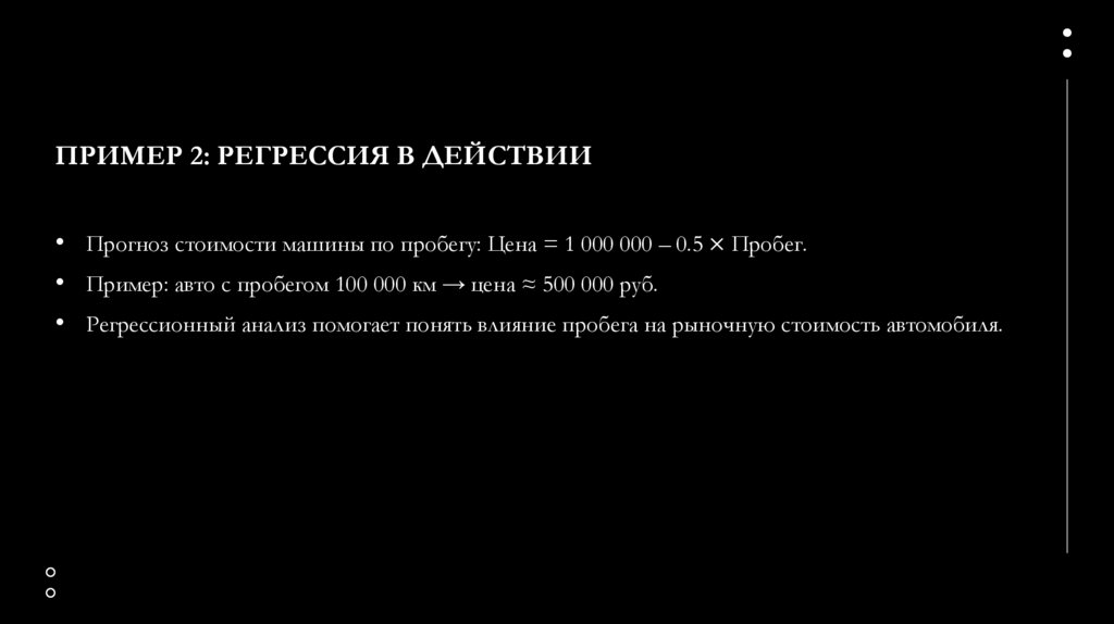 ПРИМЕР 2: РЕГРЕССИЯ В ДЕЙСТВИИ• Прогноз стоимости машины по пробегу: Цена = 1 000 000 – 0.5 × Пробег.