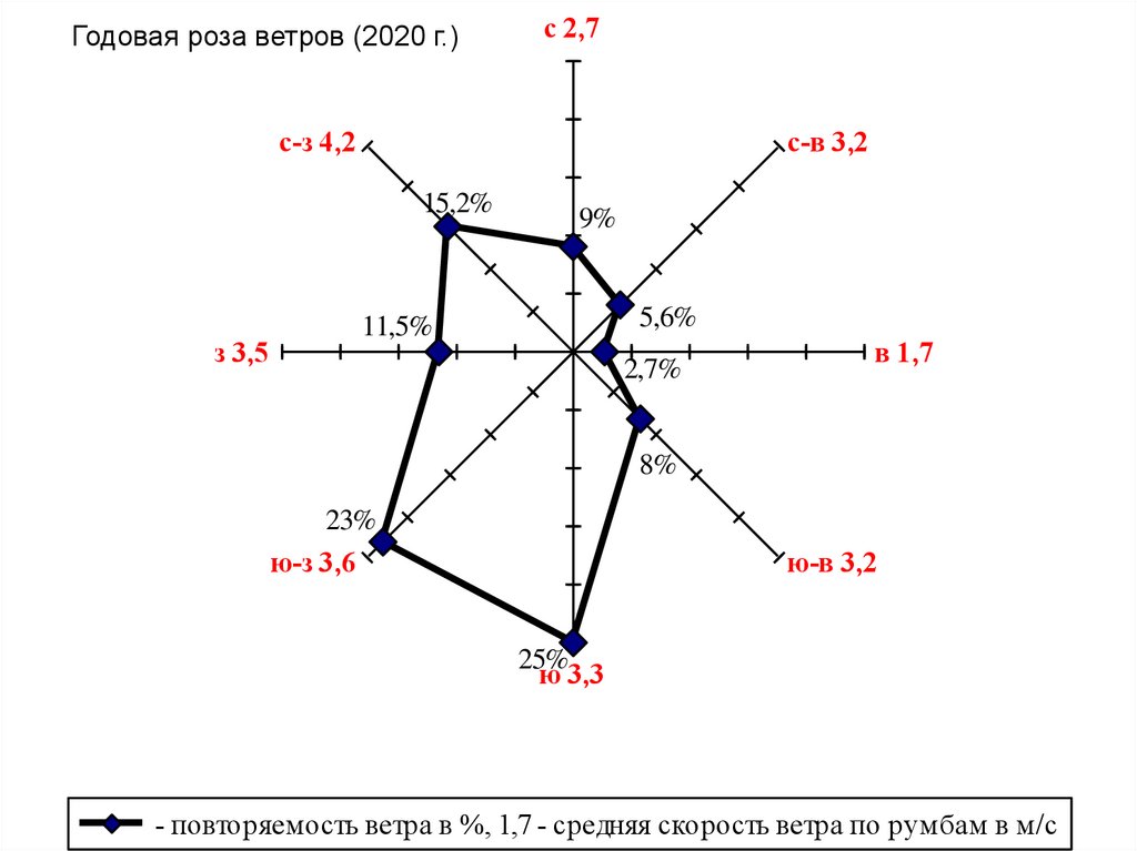 - повторяемость ветра в %, 1,7 - средняя скорость ветра по румбам в м/с