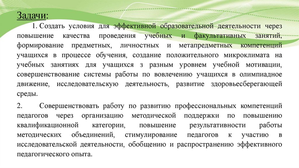 Задачи:1. Создать условия для эффективной образовательной деятельности через