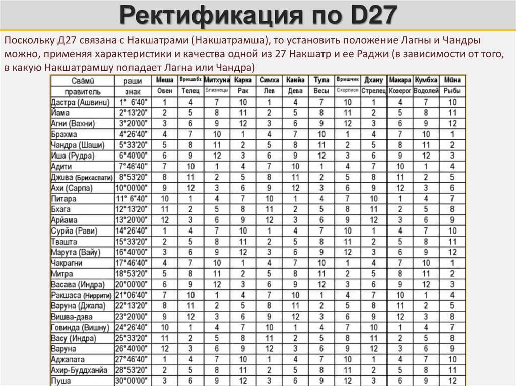 Ректификация по D27Поскольку Д27 связана с Накшатрами (Накшатрамша), то установить положение Лагны и Чандры