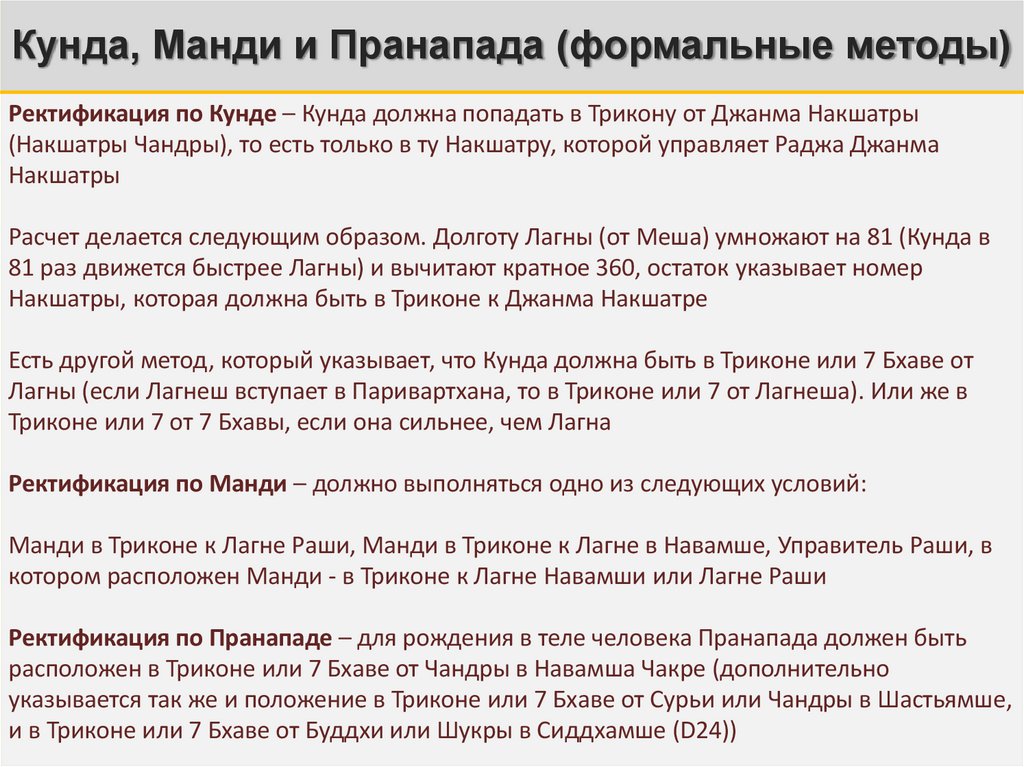 Кунда, Манди и Пранапада (формальные методы)Ректификация по Кунде – Кунда должна попадать в Трикону от Джанма Накшатры