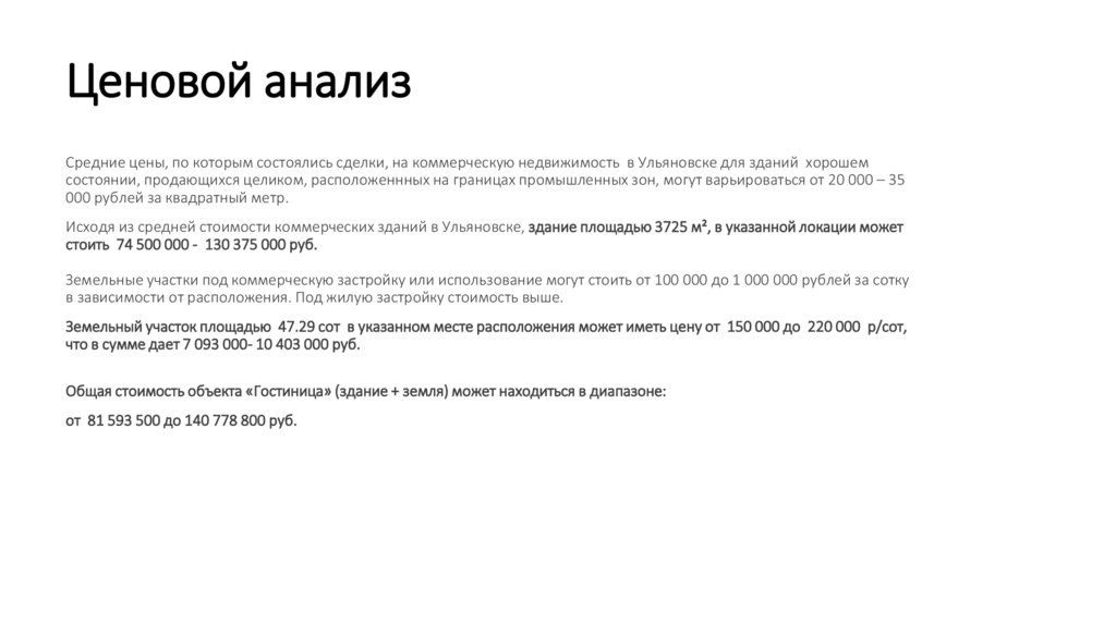 Общая стоимость объекта «Гостиница» (здание + земля) может находиться в диапазоне: