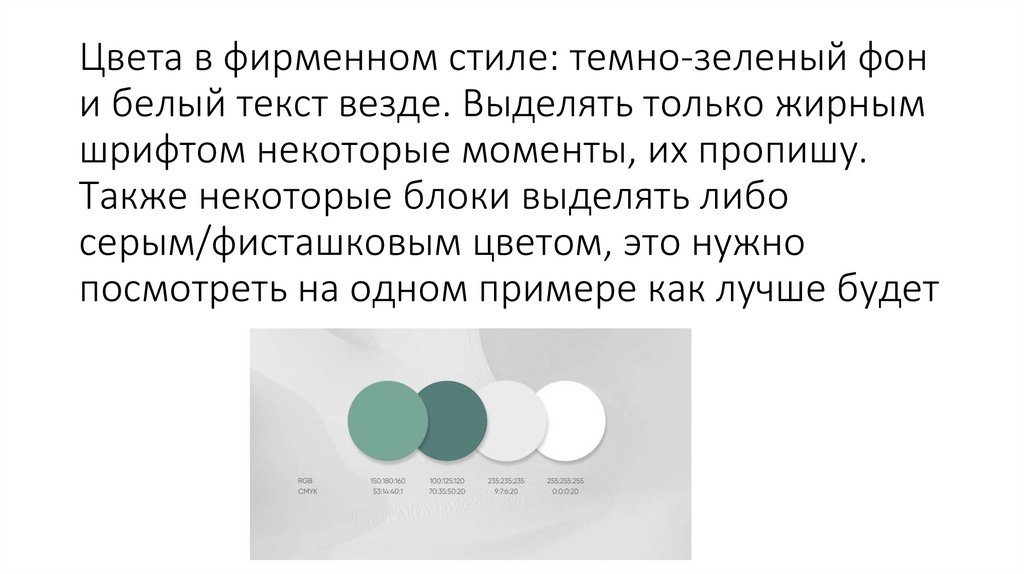 1. Цвета в фирменном стиле: темно-зеленый фон и белый текст везде. Выделять только жирным шрифтом некоторые моменты, их пропишу.