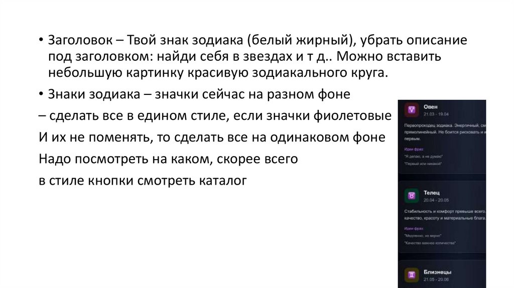 • Заголовок – Твой знак зодиака (белый жирный), убрать описаниепод заголовком: найди себя в звездах и т д.. Можно вставить