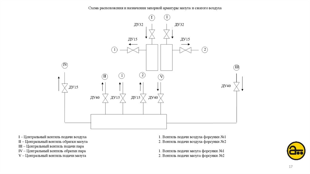 Схема расположения и назначения запорной арматуры мазута и сжатого воздухаI – Центральный вентиль подачи воздуха