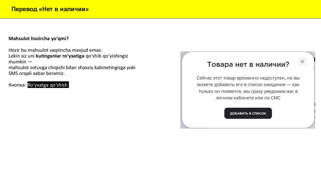 Перевод «Нет в наличии»Mahsulot hozircha yo‘qmi?