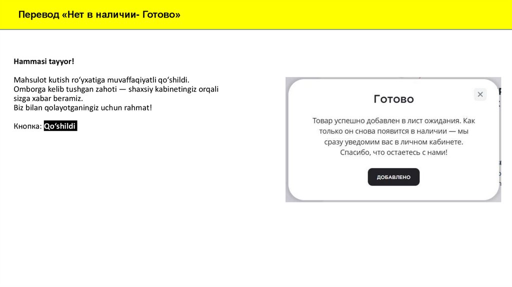 Перевод «Нет в наличии- Готово»Hammasi tayyor!