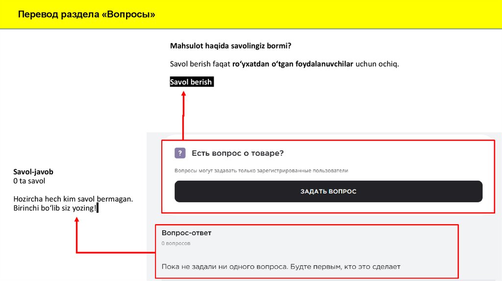 Перевод раздела «Вопросы»Mahsulot haqida savolingiz bormi?