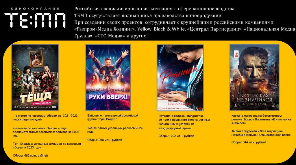 Российская специализированная компания в сфере кинопроизводства.ТЕМП осуществляет полный цикл производства кинопродукции.