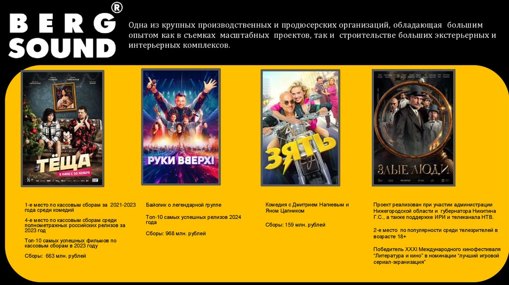 Одна из крупных производственных и продюсерских организаций, обладающая большимопытом как в съемках масштабных проектов, так и строительстве больших экстерьерных и