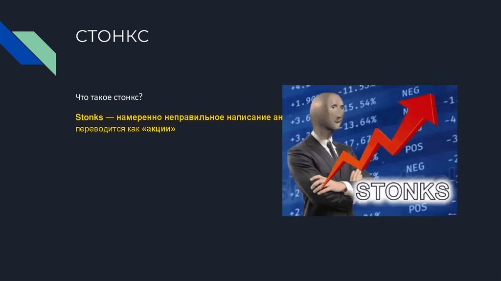 Stonks — намеренно неправильное написание английского слова stocks, которое