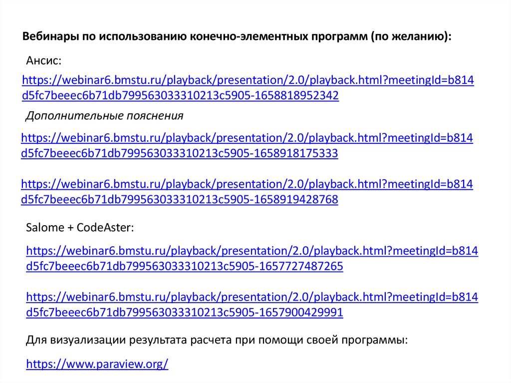 Вебинары по использованию конечно-элементных программ (по желанию):Ансис: