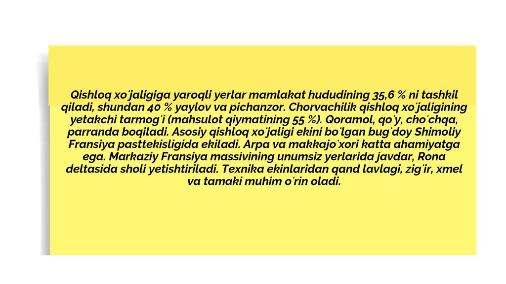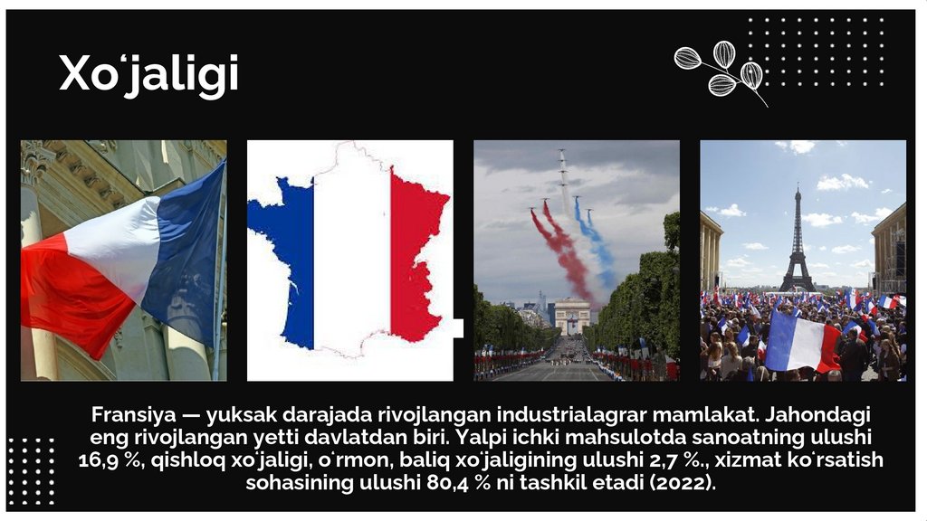 XoʻjaligiFransiya — yuksak darajada rivojlangan industrialagrar mamlakat. Jahondagi