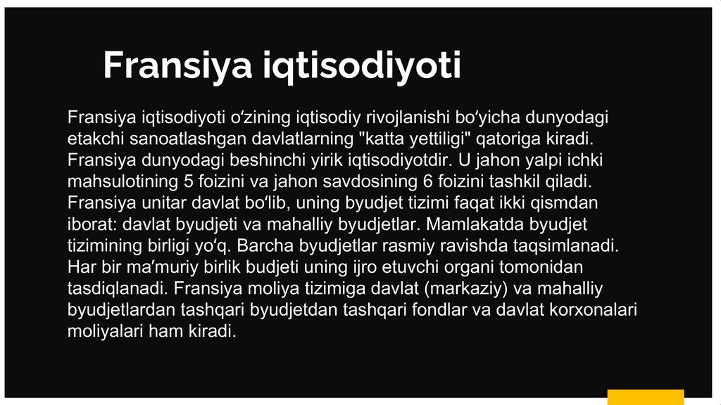Fransiya iqtisodiyotiFransiya iqtisodiyoti oʻzining iqtisodiy rivojlanishi boʻyicha dunyodagi