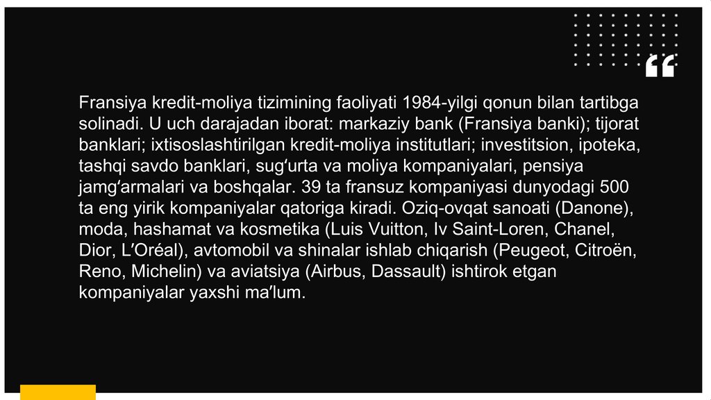 Dior, LʼOréal), avtomobil va shinalar ishlab chiqarish (Peugeot, Citroën,