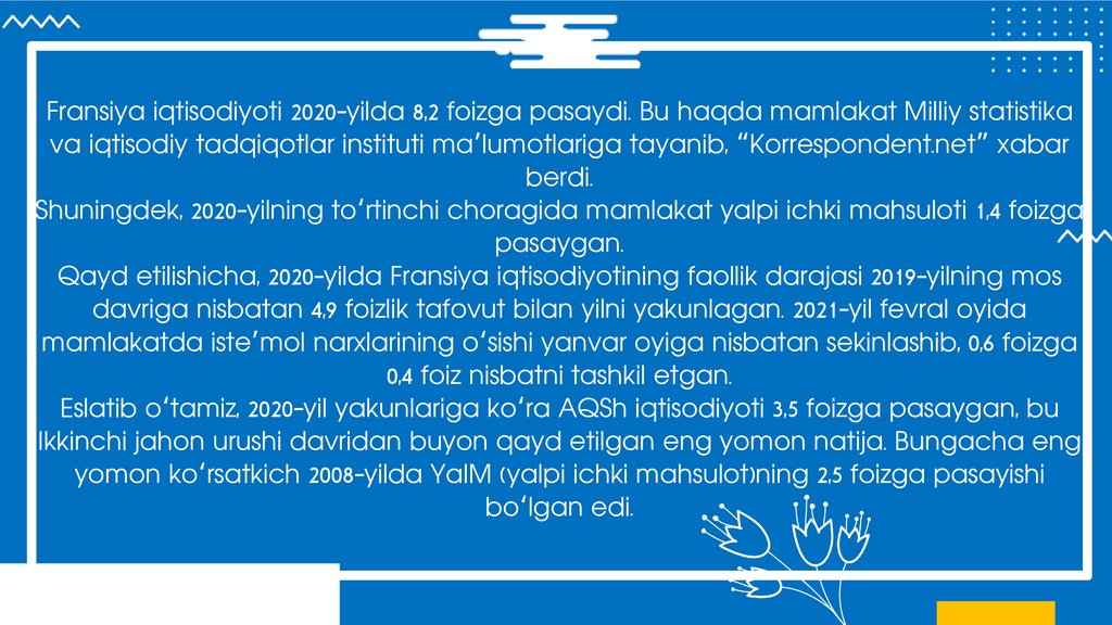 Qayd etilishicha, 2020-yilda Fransiya iqtisodiyotining faollik darajasi 2019-yilning mos