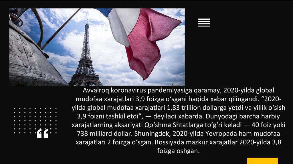Avvalroq koronavirus pandemiyasiga qaramay, 2020-yilda globalmudofaa xarajatlari 3,9 foizga o‘sgani haqida xabar qilingandi. “2020yilda global mudofaa xarajatlari 1,83 trillion dollarga yetdi va yillik o‘sish