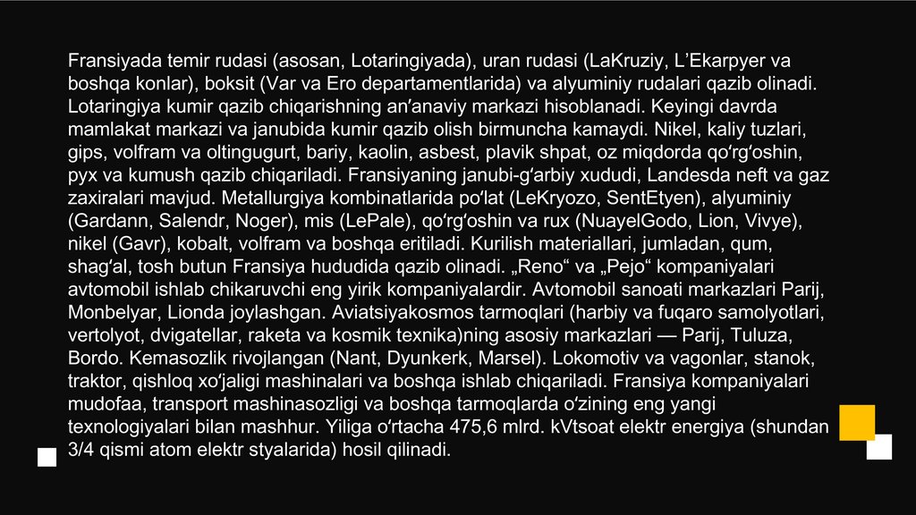 zaxiralari mavjud. Metallurgiya kombinatlarida poʻlat (LeKryozo, SentEtyen), alyuminiy